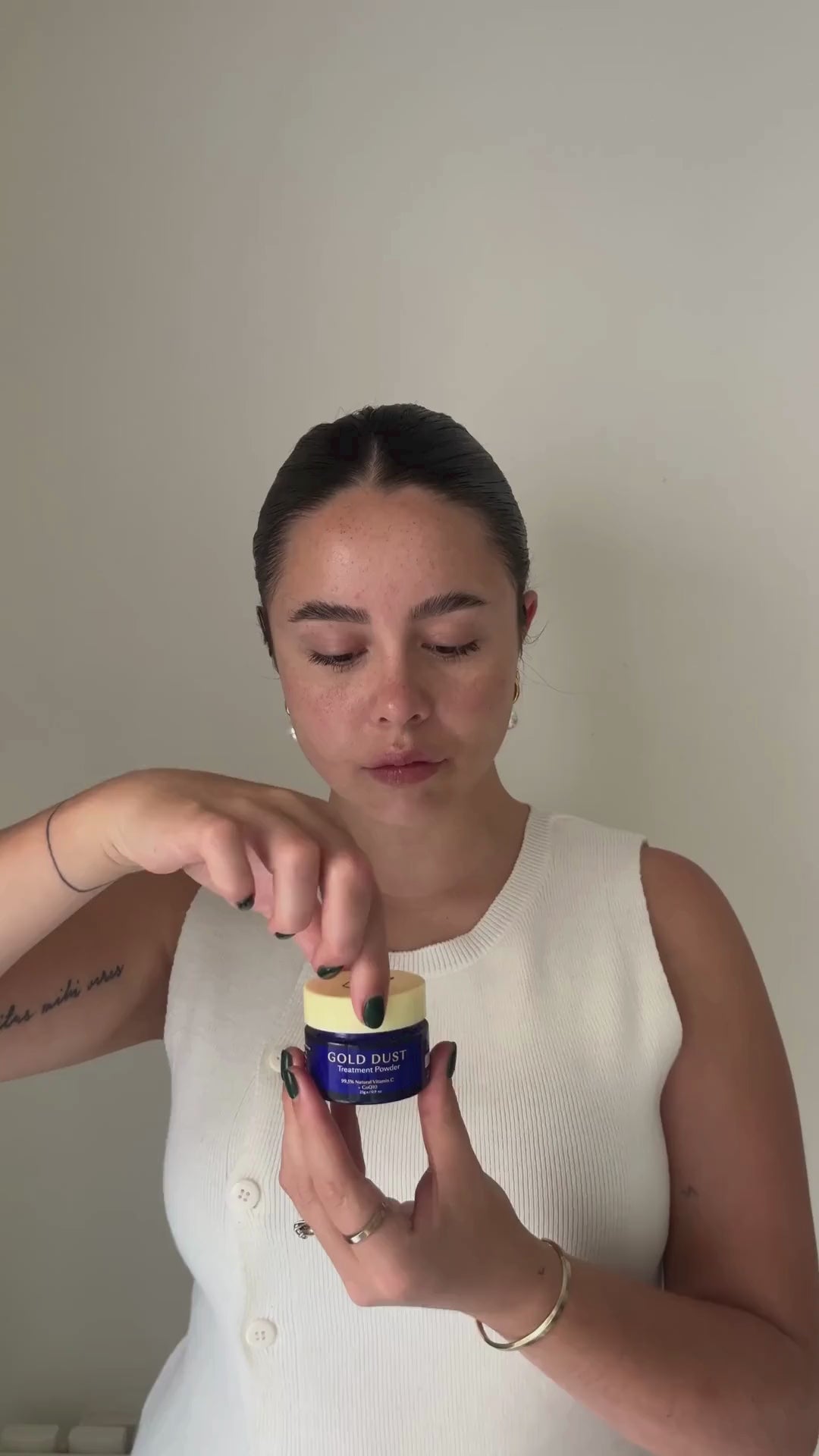 Mix a scoop of Gold Dust with your water-based serum or moisturiser to activate the vitamin C and then apply. Use on face, neck and body avoiding your eyes. The best part is that you only activate the vitamin C when you hydrate it, so there is no product waste.