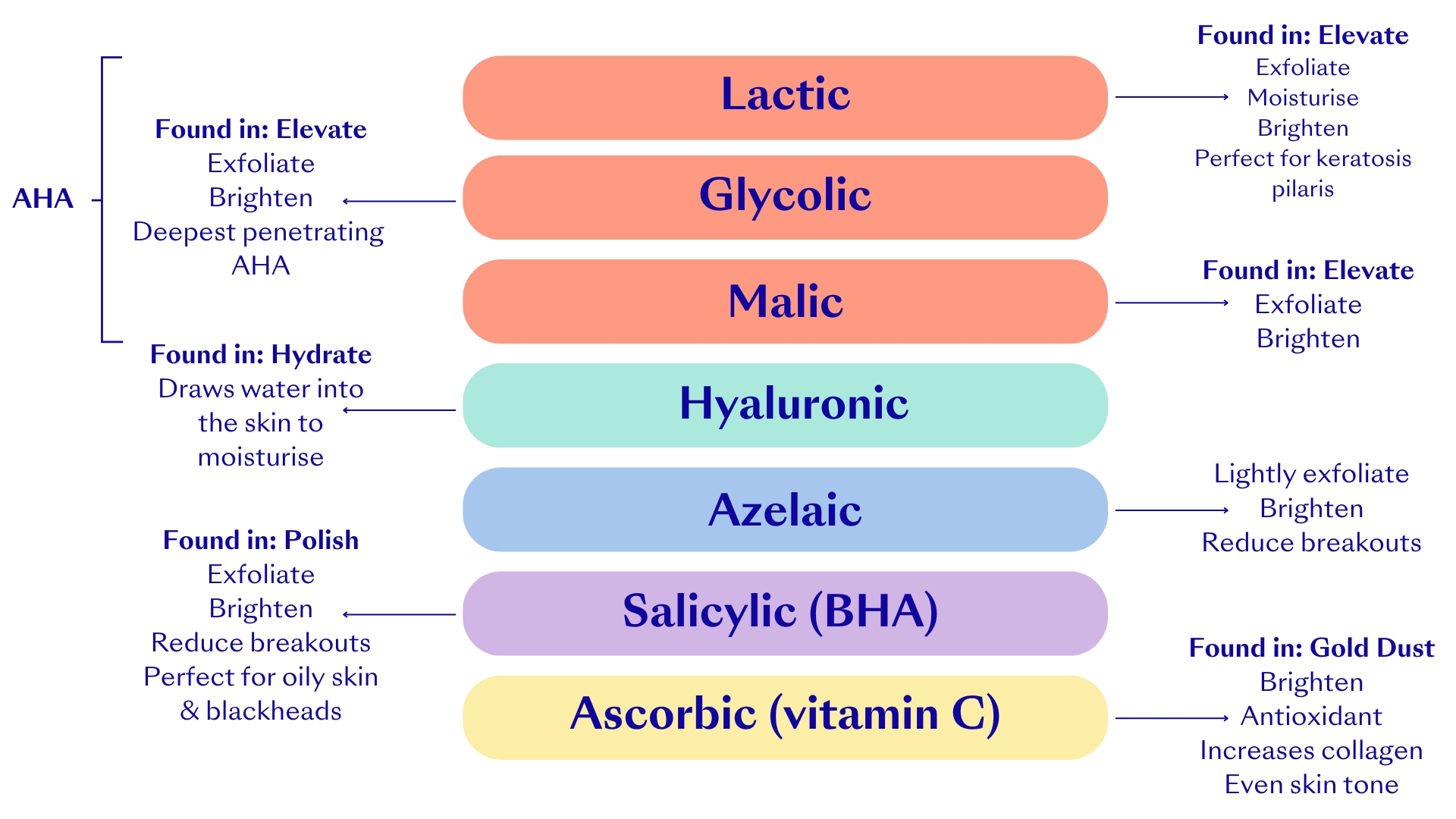 There are many types of acids used in skincare products, each offering unique skin-loving benefits to the skin. From BHA’s (Beta Hydroxy Acids) known for their deep pore cleansing ability, to AHA’s (Alpha Hydroxy Acids) known for resurfacing the skin, and then everything in-between e.g,. hyaluronic acid and ascorbic acid. Here’s a brief guide for you…
