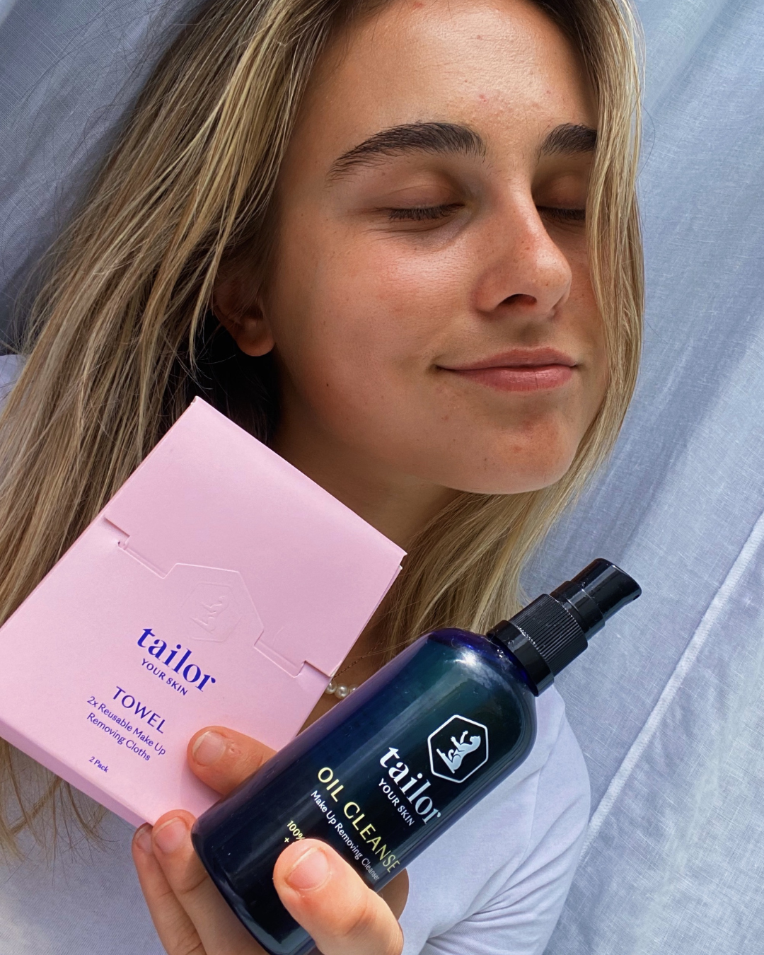 Step 2: Remove with a warm, damp Tailor Towel and follow up with night routine.