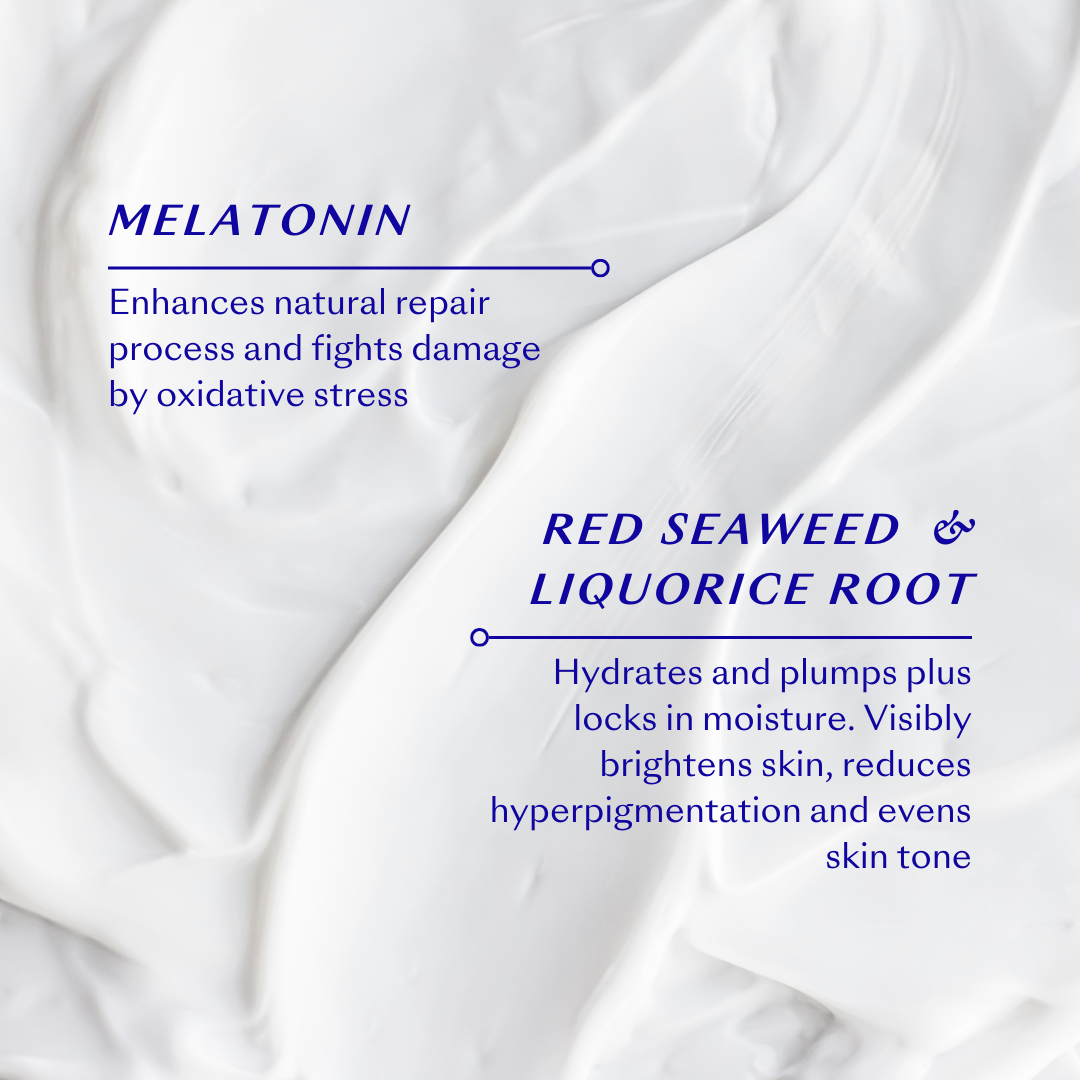 Enhances natural repair process and fights oxidative stress by stimulating your body's natural production of antioxidant enzymes during the night. Clinical studies show topical use of melatonin increases collagen production in your skin, stimulates your skin’s natural regenerative processes at night, reduces signs of ageing, and repairs sun damage on your skin.