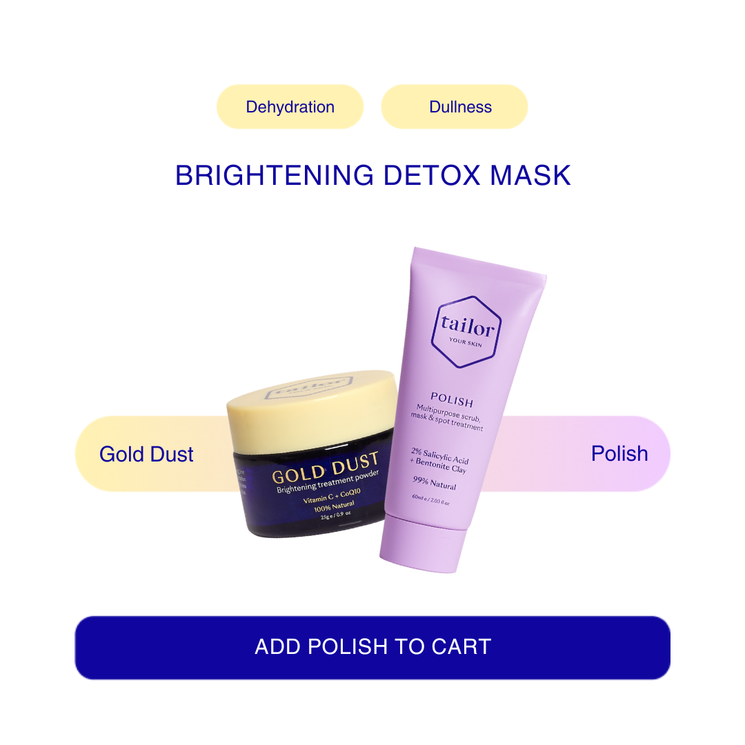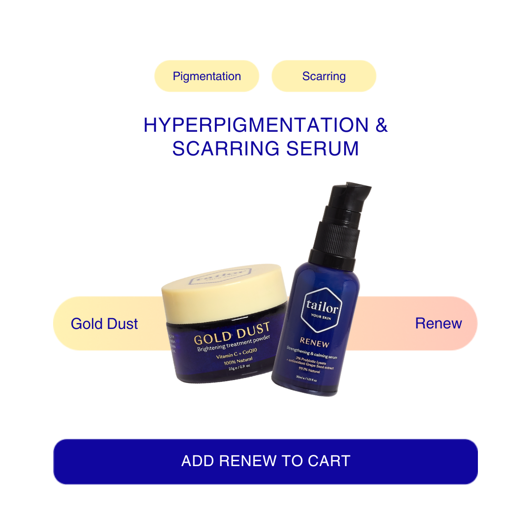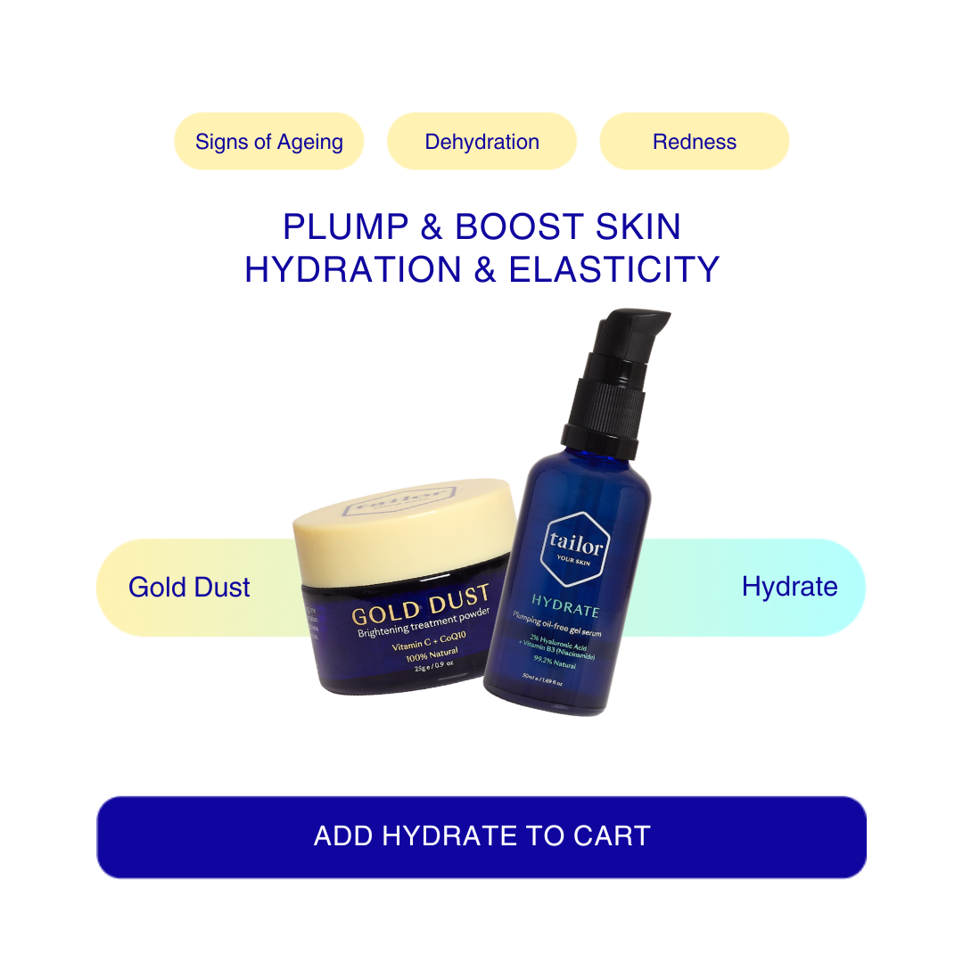 Unlike a vitamin C serum or cream, Gold Dust is a dry powder. In order to activate the vitamin C, it needs to be mixed with a water-based product. Tailor Renew, Moisture or Hydrate can all be used with Gold Dust. You will not get the full effects of Gold Dust by mixing it with an oil or oil-based product, so save the oils for later in your skincare routine.