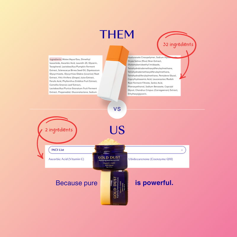 So pure it contains only two ingredients, Ascorbic Acid (vitamin C) & CoQ10. This powerful duo will improve skin texture and brighten complexion in just days.